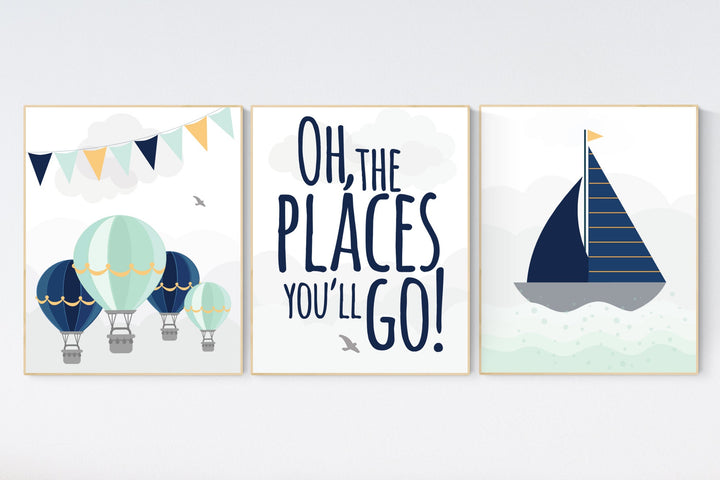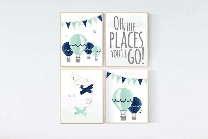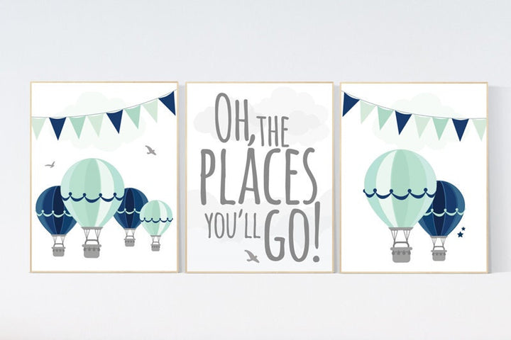 Mint navy nursery wall art, hot air balloon Nursery, mint and navy, gender neutral, baby room wall art, gender neutral, mint green, boy