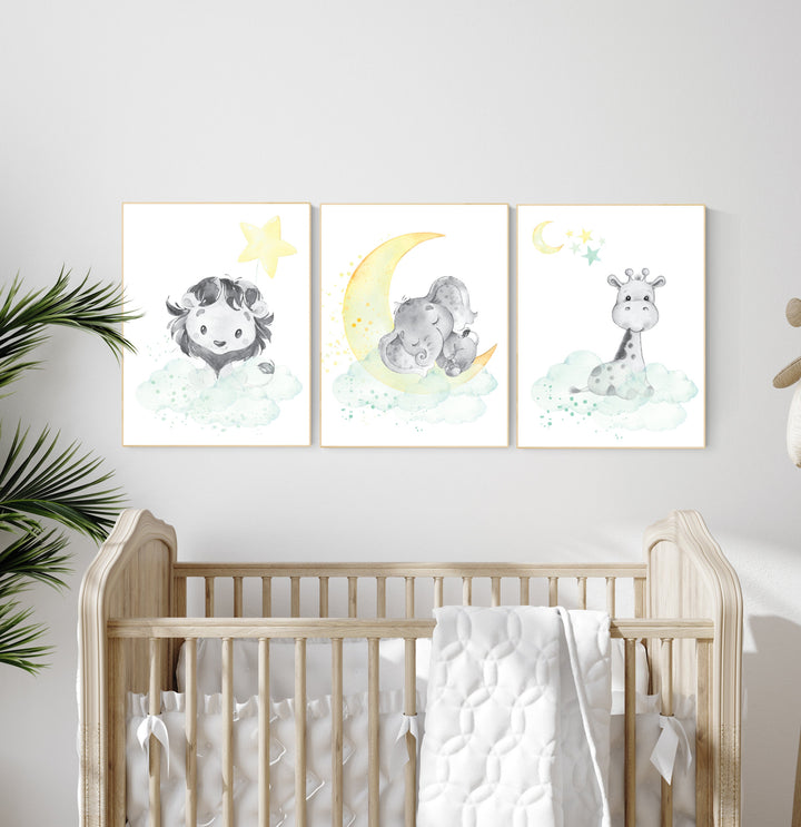 Mint and yellow nursery, nursery wall art neutral, moon and stars nursery, baby room decor, elephant, giraffe, lion, gender neutral prints