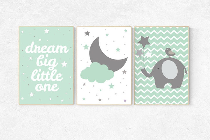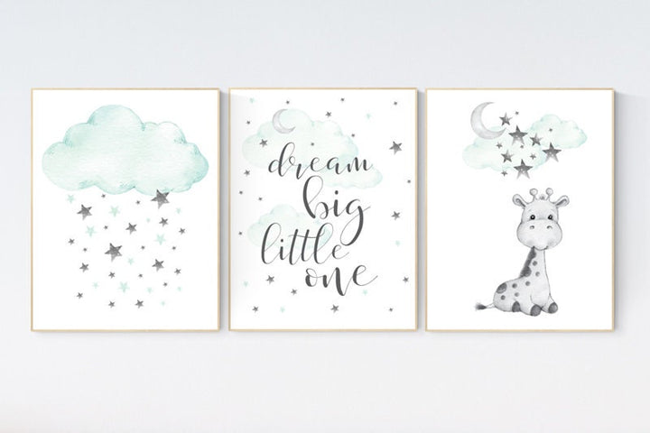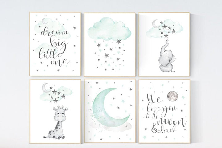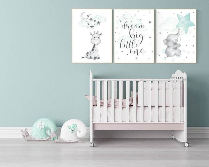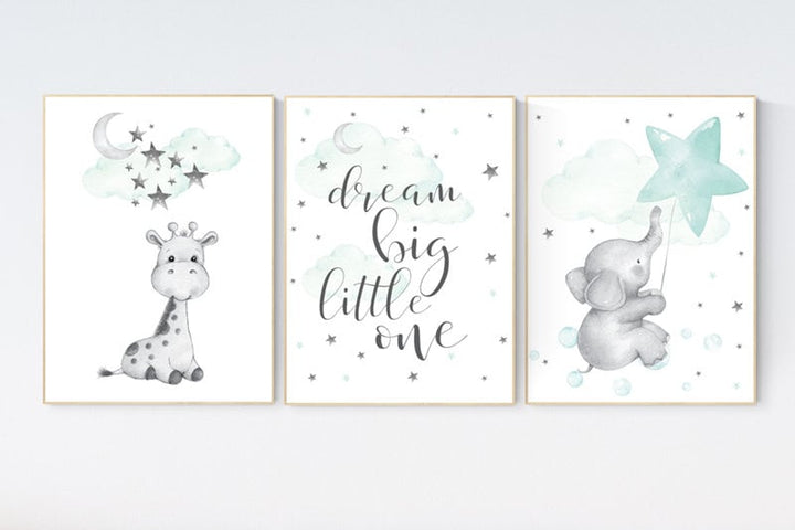 Mint nursery decor, gender neutral, giraffe nursery wall art, elephant nursery, dream big little one, baby room wall art, moon, cloud, stars