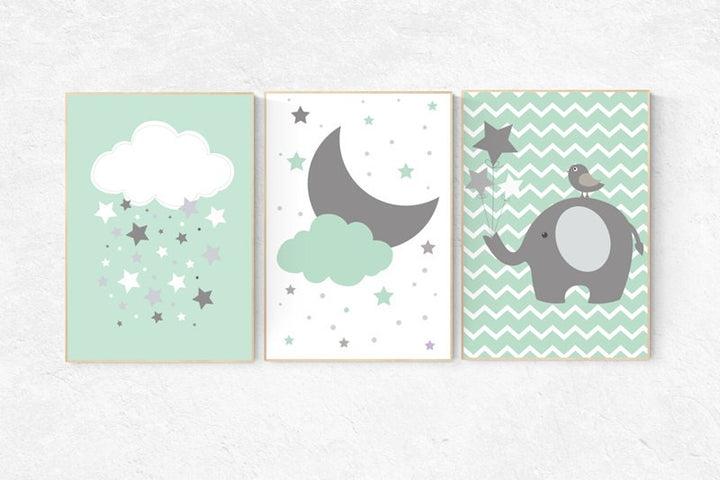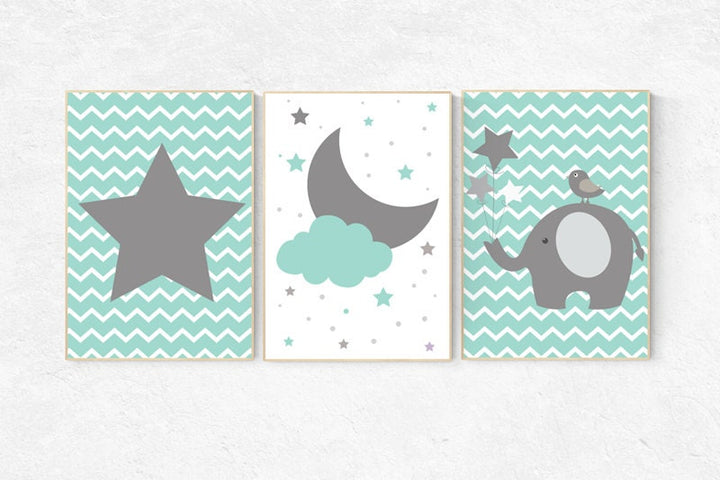 Mint nursery decor, Elephant Nursery Art, mint green nursery wall art, gender neutral, baby room wall art, teal, aqua, cloud and stars