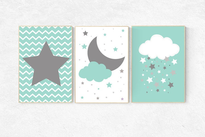 Mint nursery decor, cloud nursery mint nursery, star nursery decor, nursery wall art, set of 3, nursery prints, baby room decor mint nursery