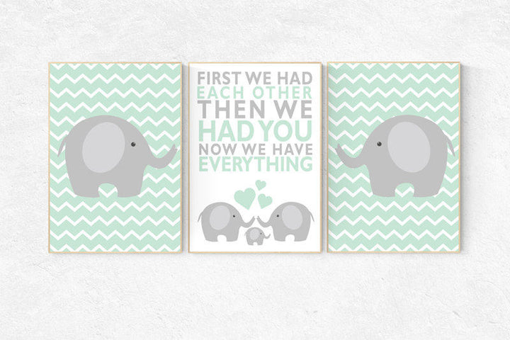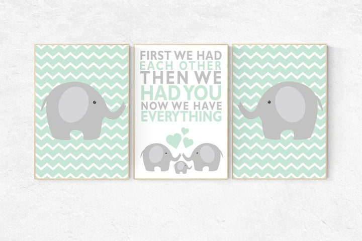 Mint nursery decor, First We Had Each Other, elephant Nursery, Nursery Art, Nursery Decor, gender neutral nursery, set of 3, playroom decor