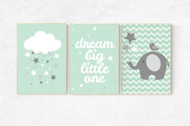 Mint nursery decor, gender neutral, giraffe nursery wall art, elephant nursery, dream big little one