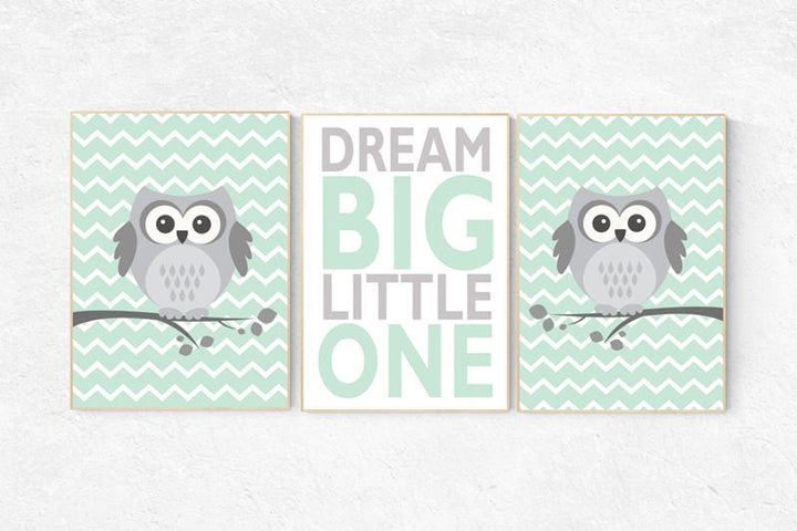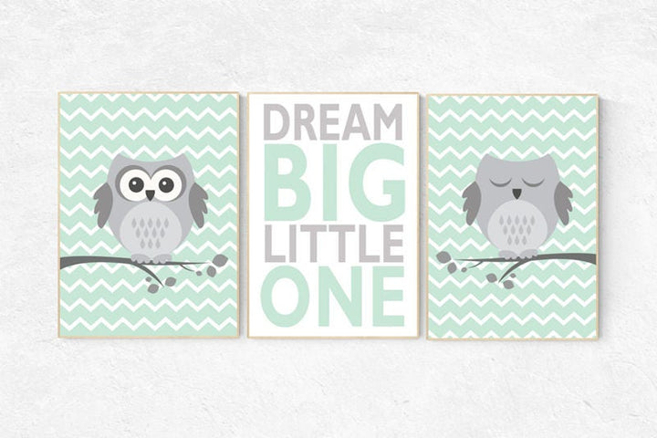 Mint nursery decor, dream big little one, Owl nursery wall art, mint gray, gender neutral nursery decor, owl nursery decor, nursery wall art