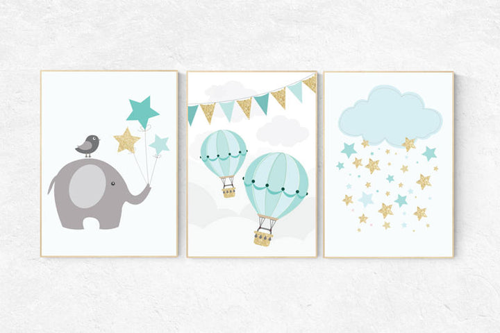 Mint nursery decor, mint and gold nursery wall art, hot air balloon nursery wall art, elephant nursery hot air balloon nursery cloud nursery