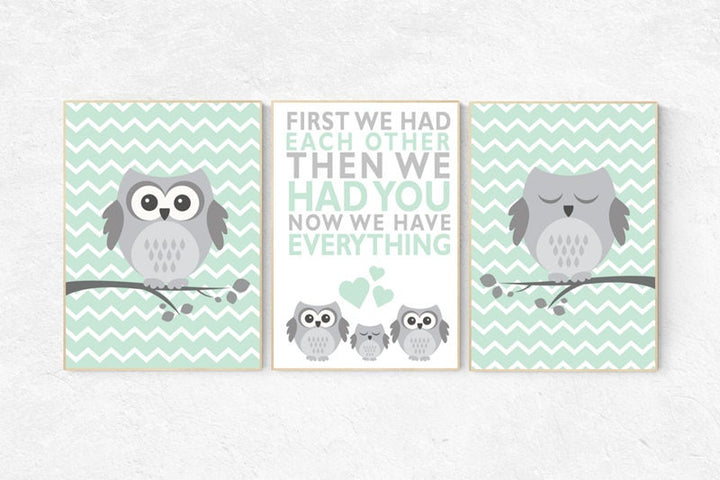 Mint nursery decor, First We Had Each Other, owl Nursery, Nursery Art, Nursery Decor, gender neutral nursery, set of 3, playroom decor