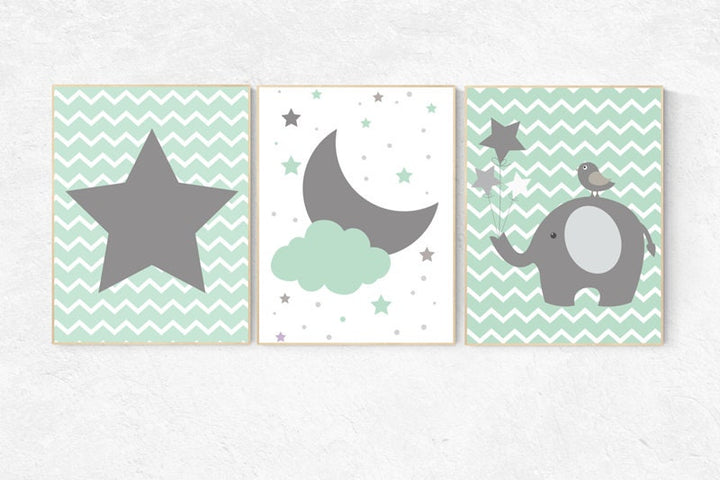 Mint nursery decor, elephant nursery, name print, mint green nursery decor, mint green nursery, moon and stars nursery, gender neutral