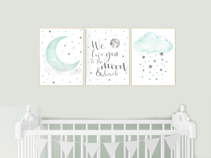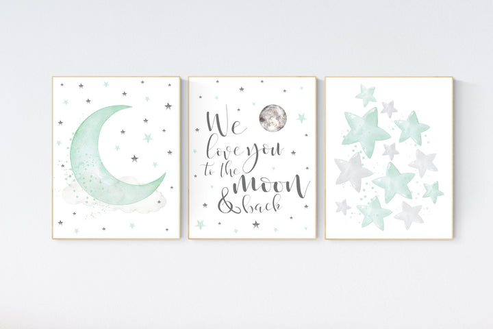 Mint nursery decor, gender neutral nursery, we love you to the moon and back, mint green, moon stars