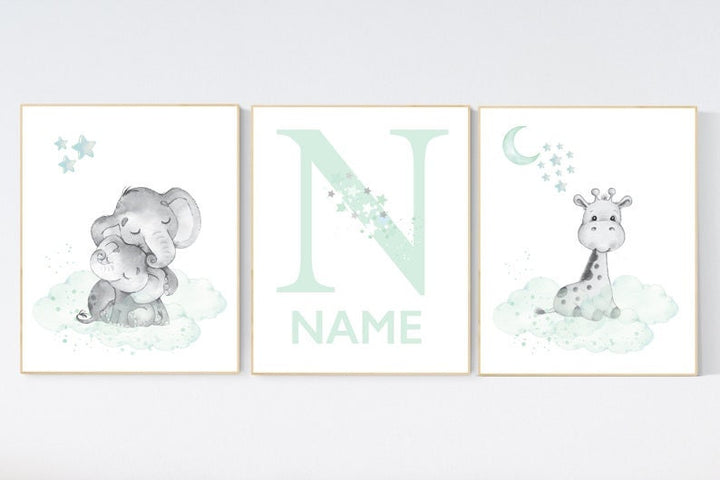 Mint nursery decor, elephant nursery, name print, giraffe nursery, mint green nursery, moon and stars nursery, gender neutral nursery