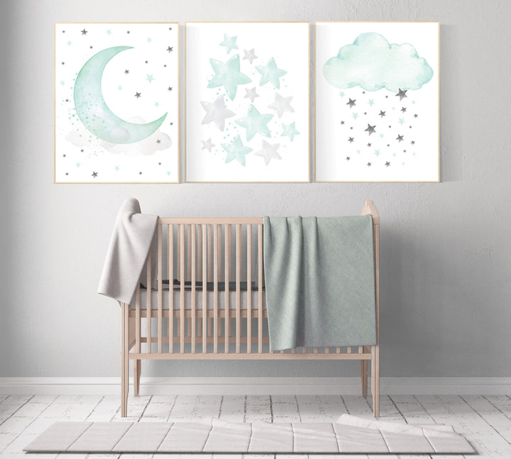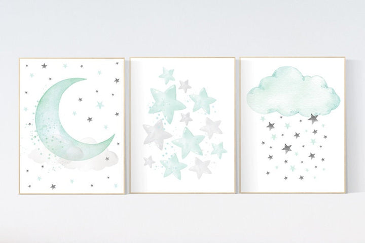 Mint nursery decor, nursery decor stars, gender neutral nursery, moon and stars nursery, mint green nursery, cloud nursery, star nursery art