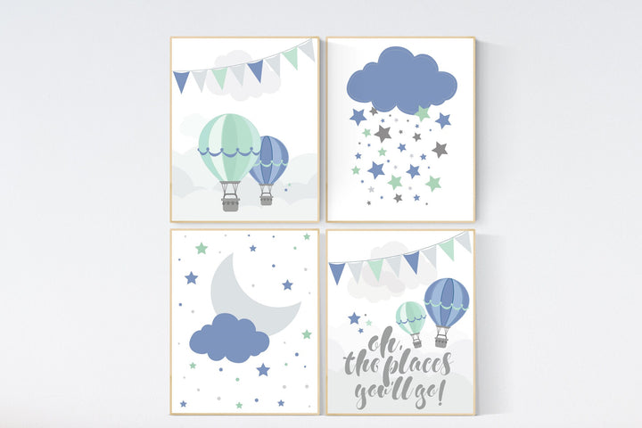 Navy blue wall art, blue and mint gray nursery, blue, mint, grey nursery, oh the places you'll go, hot ait balloon nursery, travel theme