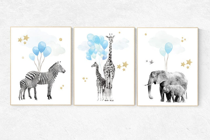 Animal nursery prints, safari nursery decor, blue gold nursery, Safari Nursery, Baby Animal Print set, baby animal art, elephant nursery