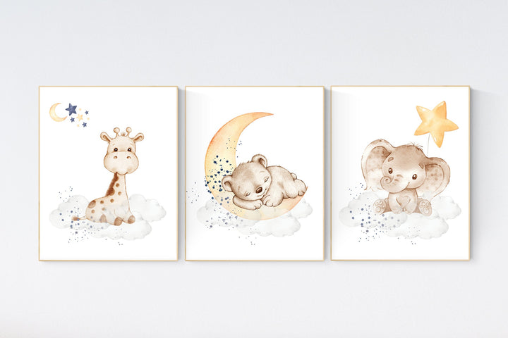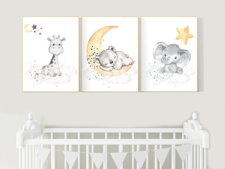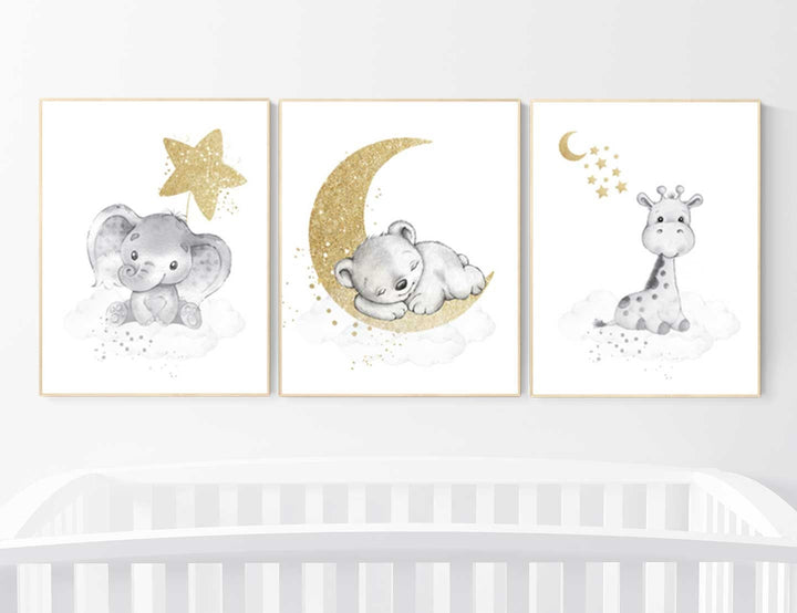 Animal nursery, gender neutral, grey gold, moon and stars, elephant and giraffe nursery, bear, baby bear, nursery decor twins, gray nursery