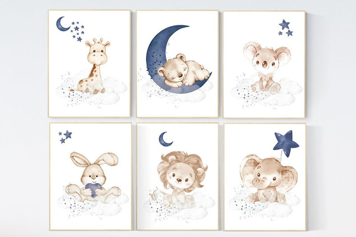 Animal nursery wall art, Nursery decor boy , elephant, bunny, bear, giraffe, lion, koala, baby room art, navy blue nursery, animal prints
