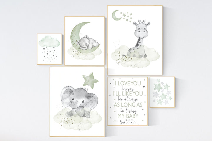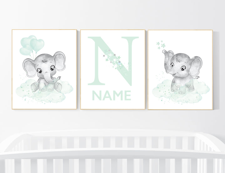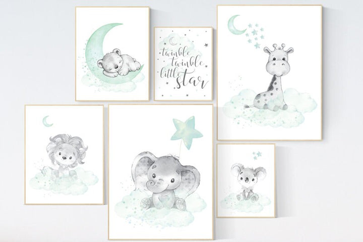 Animal nursery, Mint nursery decor, elephant nursery, name print, mint green nursery decor, mint green, moon and stars, gender neutral