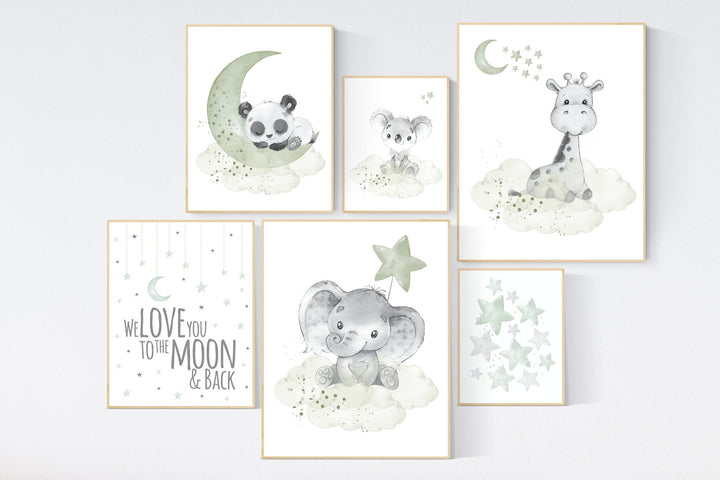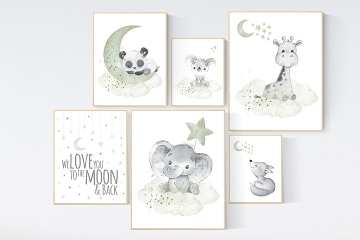 Animal nursery wall art, Nursery decor gender neutral, sage nursery, elephant, panda, giraffe, koala, animal prints nursery, sage green,