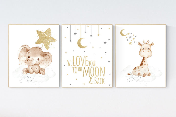 Animal nursery, gender neutral, grey gold, nursery prints, elephant and giraffe nursery, we love you to the moon and back, nursery decor
