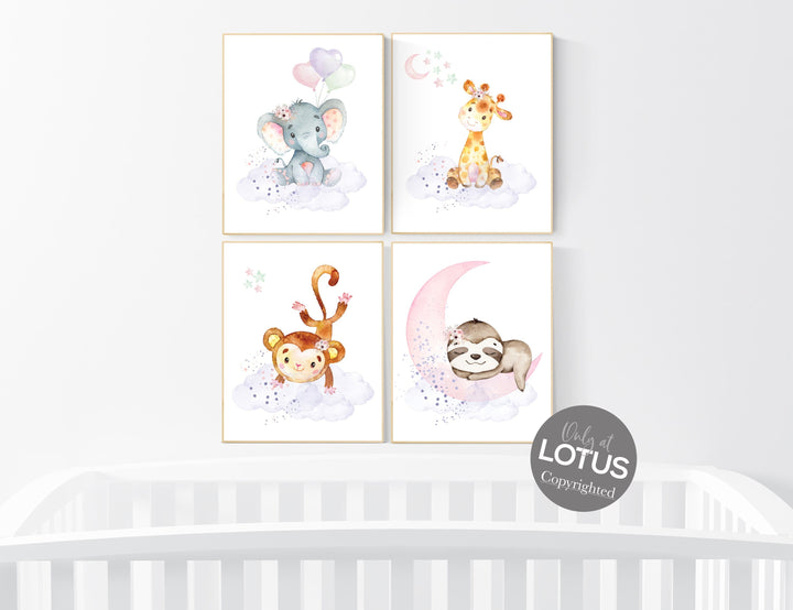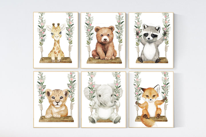 Animal nursery, animal on swing, Jungle Animals, Safari Animal Nursery Prints, safari animals, safari nursery, blush pink flowers, girl