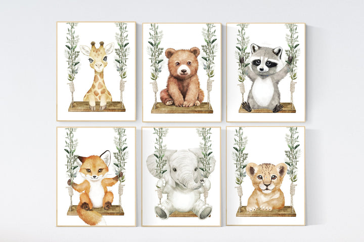 Animal nursery, animal on swing, Jungle Animals, Safari Animal Nursery Prints, safari animals, safari nursery, Greenery, gender neutral
