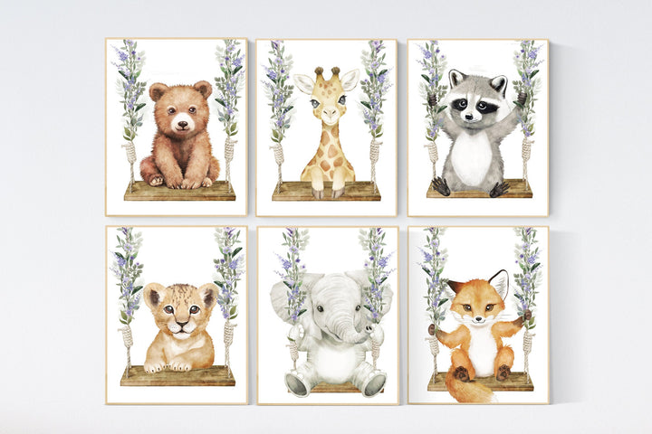 Animal nursery, animal on swing, Jungle Animals, Safari Animal Nursery Prints, safari animals, safari nursery, purple flowers, girl nursery