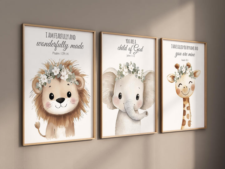 Animal Nursery Prints: Lion, Elephant, Giraffe, Christian Decor