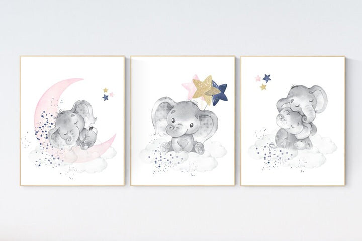 Navy nursery decor, moon and stars, pink, gold, navy nursery art. baby room wall art, nursery decor, set of 3, nursery prints, elephant art