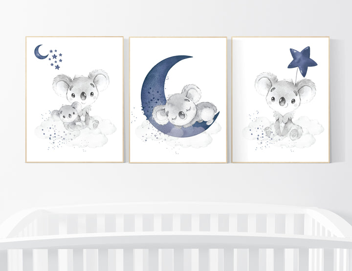 Navy nursery decor, koala nursery, moon and stars, navy blue nursery art, nursery prints animals, boy nursery decor, koala mother and baby