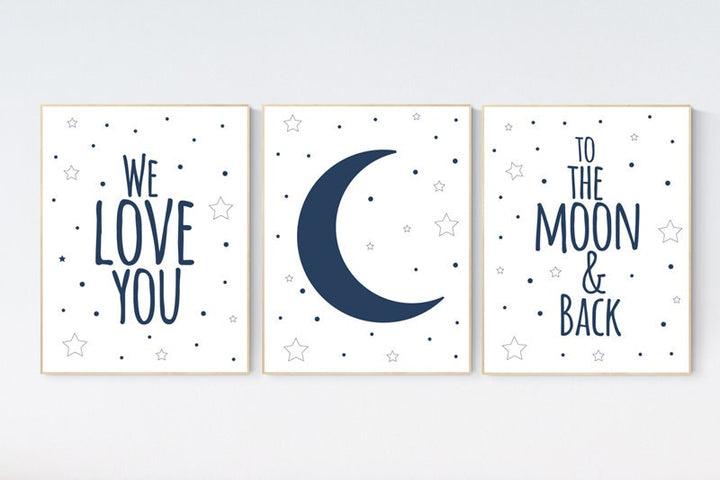 Navy nursery decor, We love you to the moon and back, moon prints, gender neutral baby, navy nursery, nursery wall art neutral, baby room
