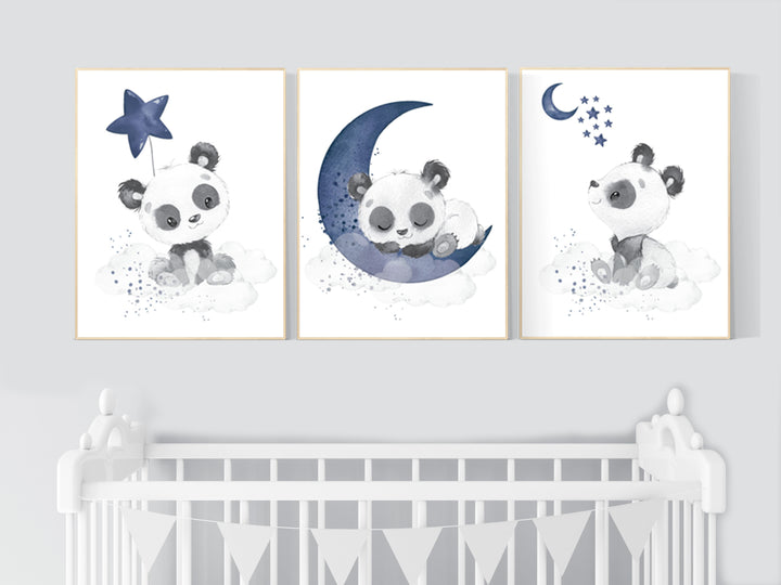 Navy nursery decor, panda nursery, moon and stars, navy blue nursery art, baby room wall art