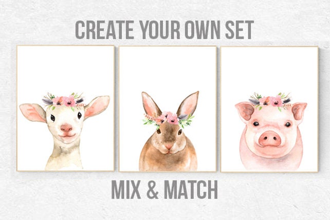 Nursery decor animals, farm animals, nursery prints woodland, animal flower crown, nursery prints animals, animal prints, nursery wall art