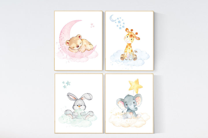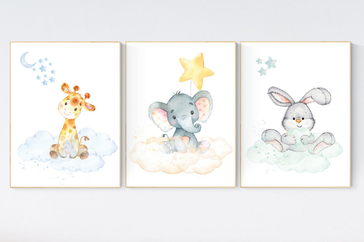 Nursery decor animals, gender neutral, animal prints, bunny, elephant, giraffe, bear, nursery wall decor, animal nursery, pastel colors