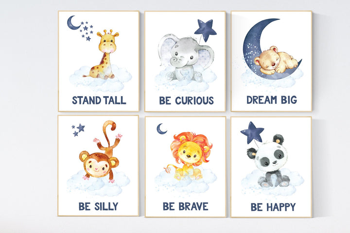 Nursery decor animals, elephant, giraffe, koala, lion, animal nursery prints, navy blue, baby room wall decor, animal prints, nursery prints