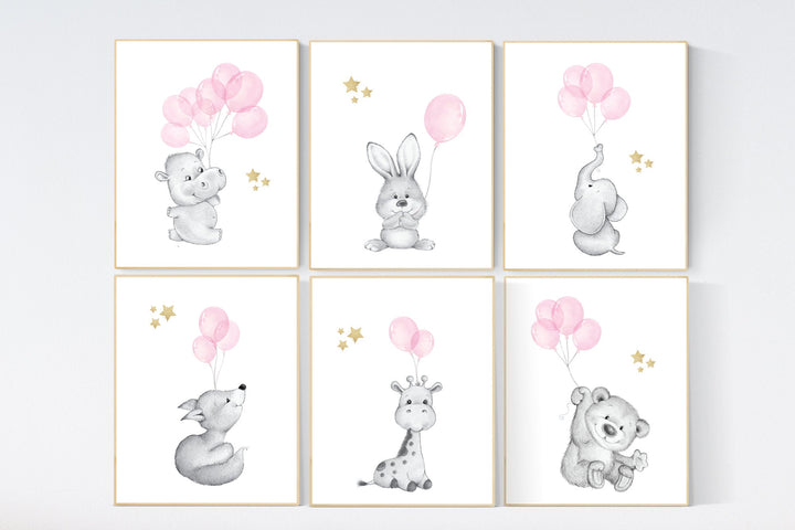Nursery decor animals, animal balloon print, nursery decor girl, elephant, bunny, giraffe, fox, nursery wall art girl, pink and gold