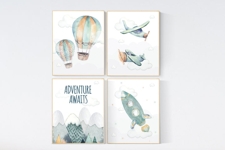 Nursery decor adventure, adventure awaits, nursery prints neutral, hot air balloon, rocket nursery, plane wall art nursery, gender neutral