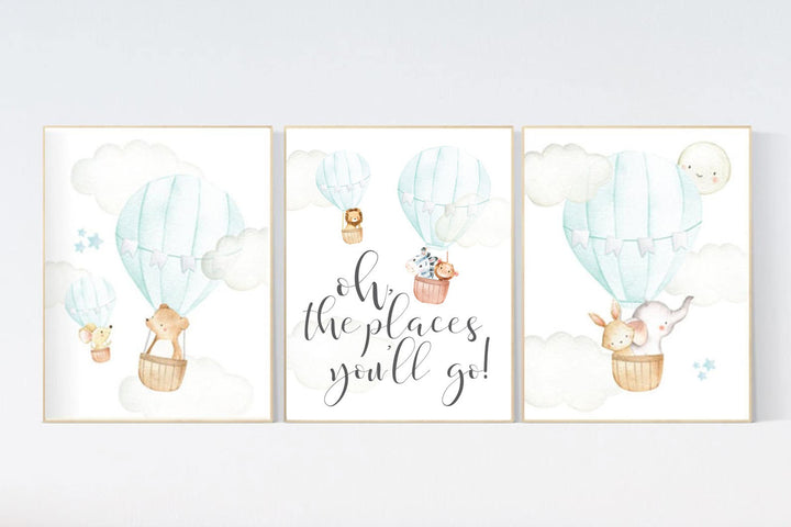 Nursery decor animals, nursery wall art mint green, Hot air balloon nursery, elephant, giraffe, bear, bunny, woodland animals, aqua, mint