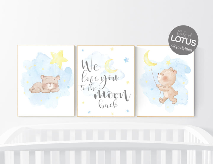 Nursery decor bear, gender neutral nursery, blue and yellow, bear nursery print, nursery wall art, we love you to the moon and back