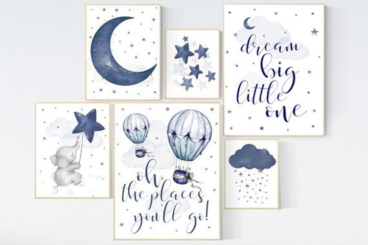Nursery decor boy elephant, nursery wall art boy, moon and stars, navy blue, dream big little one, navy nursery set, hot air balloon