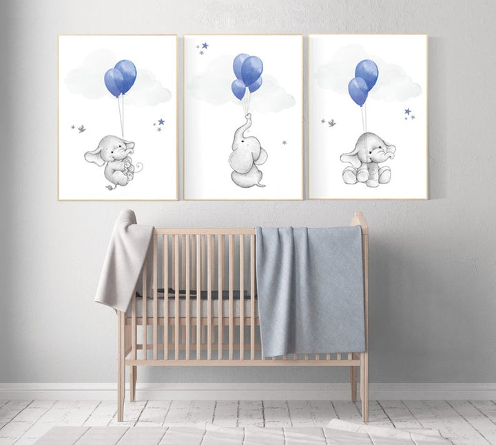 Nursery decor boy elephant, Nursery decor boy hot air balloon, elephant balloon, baby room decor, blue and gray nursery, nursery prints