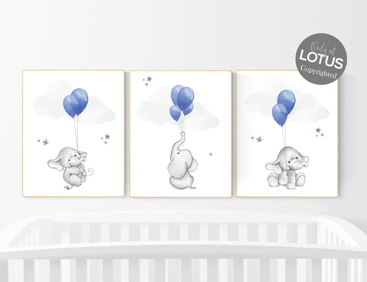Nursery decor boy elephant, navy nursery wall art, elephant balloon print, navy blue