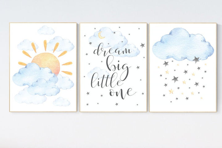 Nursery decor clouds, sunshine nursery, gender neutral nursery wall art, dream big little one, sun, cloud, baby room decor, blue yellow