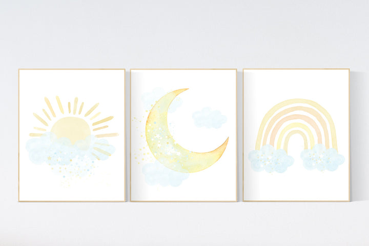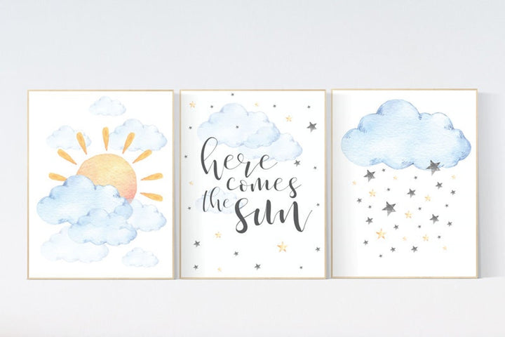 Nursery decor clouds, sunshine nursery, gender neutral nursery wall art, sun, cloud, baby room decor, blue yellow, nursery wall decor