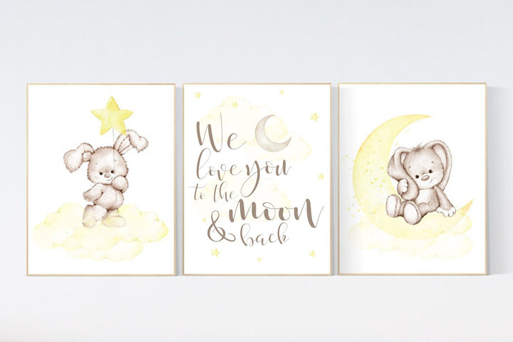 Nursery decor bunny, yellow nursery, rabbit nursery, yellow nursery, we love you to the moon and back, gender neutral, bunny nursery art