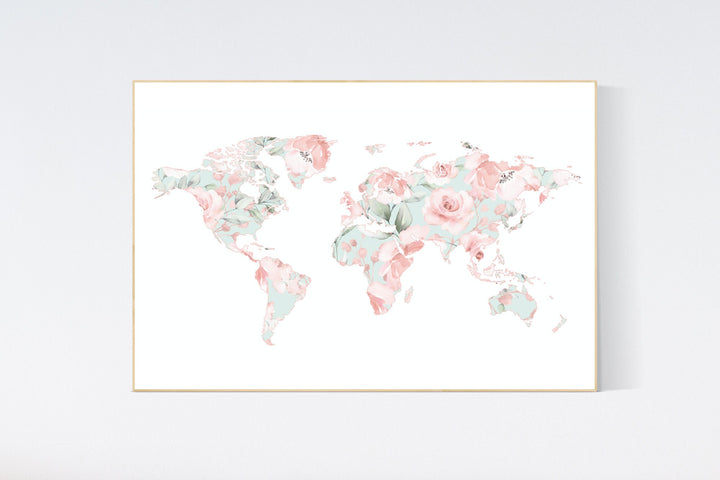 Nursery decor coral mint, Floral World Map, Girl Nursery Decor, Travel Nursery Art, floral Nursery Print, blush mint, floral nursery