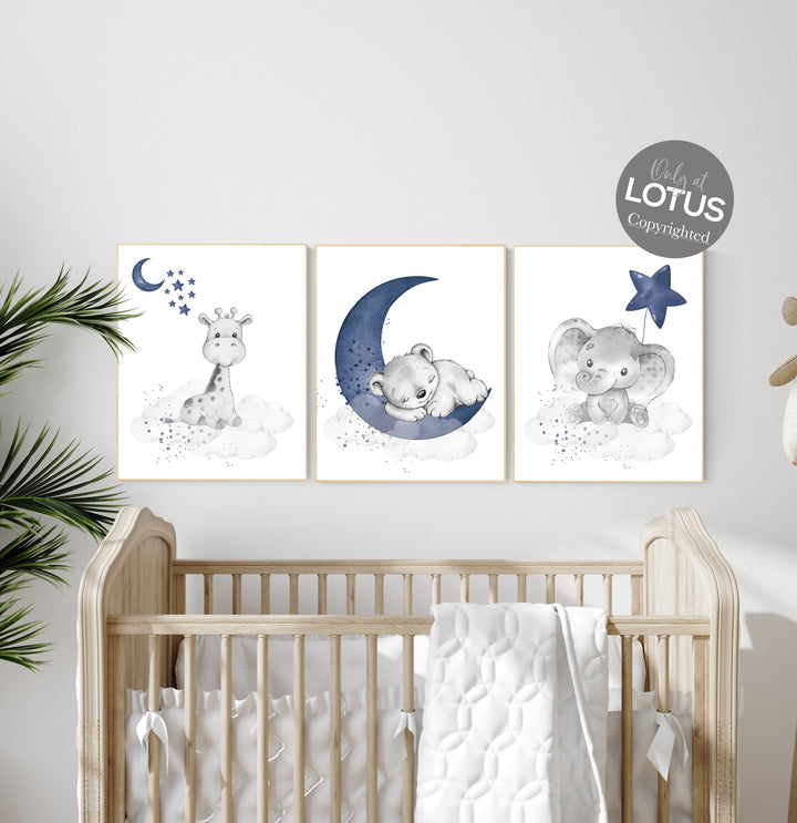 Nursery decor elephant and giraffe, animal nursery prints, koala nursery, navy nursery, navy blue nursery, baby room wall art, woodland