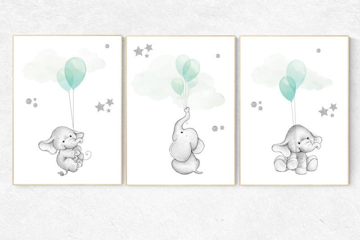 Nursery decor elephant, gender neutral nursery decor, nursery wall art animals, elephant balloon print, mint nursery decor, mint silver,