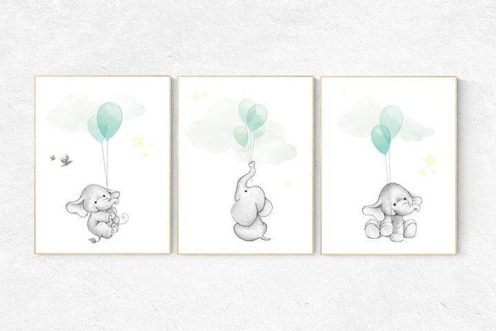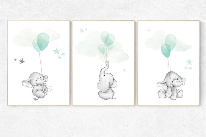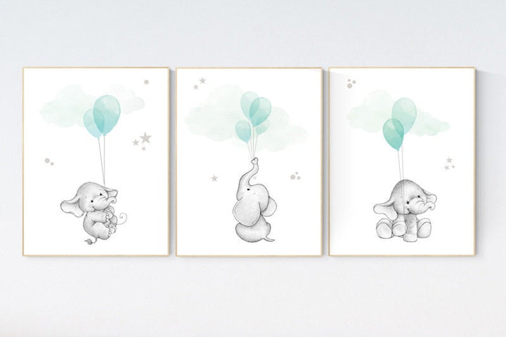 Nursery decor elephant, gender neutral nursery decor, nursery wall art animals, elephant balloon print, mint nursery decor, mint nursery