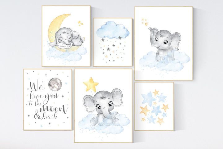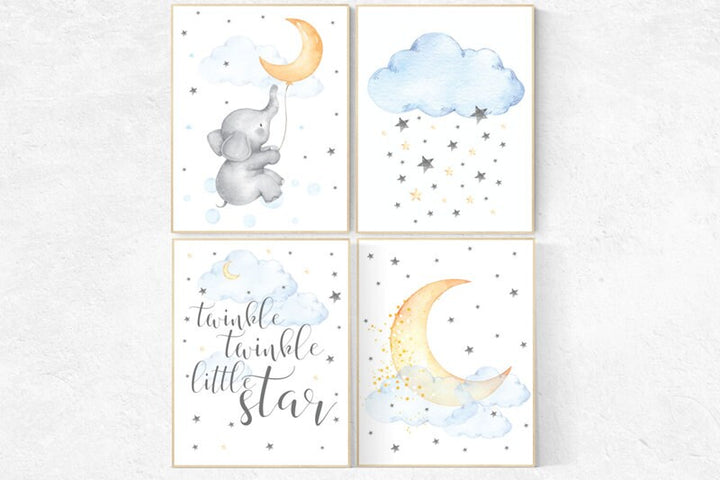 Nursery decor elephant, gender neutral, elephant nursery wall art, yellow blue, twins, unisex, nursery wall decor, moon and stars, baby room