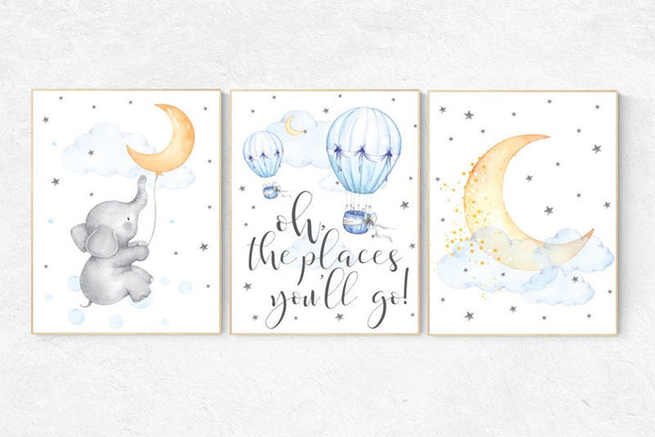 Nursery decor elephant, Gender neutral nursery decor, blue yellow, giraffe, elephant, nursery wall art, baby room decor, hot air balloon