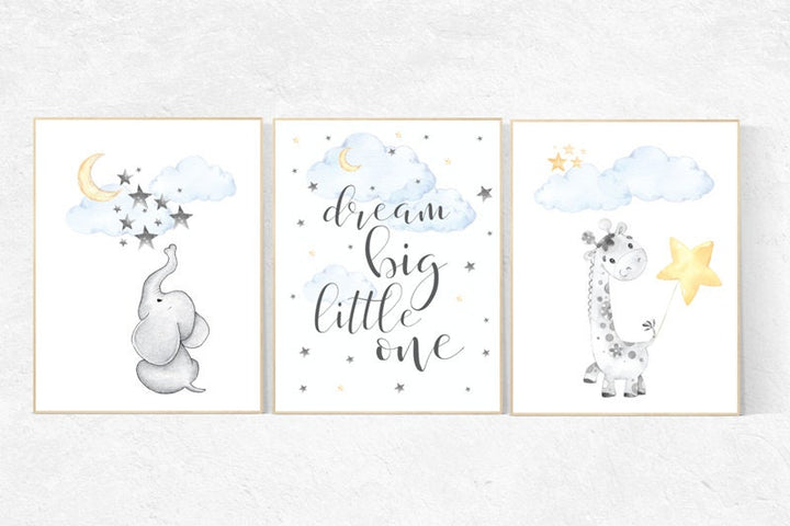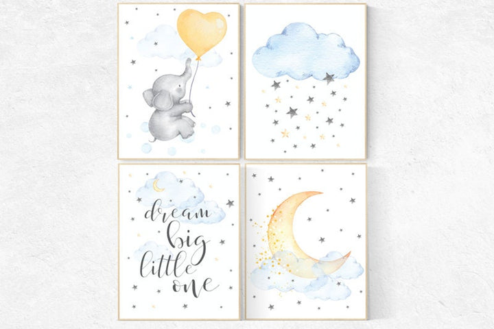 Nursery decor elephant, gender neutral, dream big little one, moon and cloud nursery decor, Nursery decor neutral, yellow blue, twin nursery