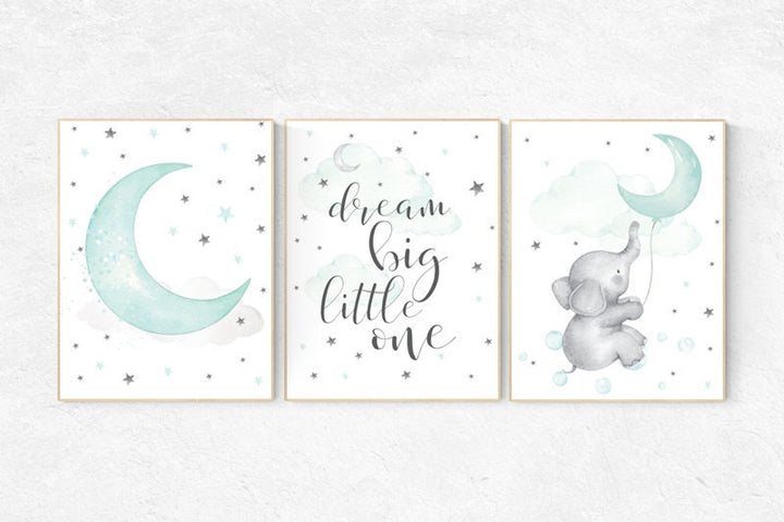Nursery decor elephant, dream big little one, gender neutral nursery, Mint nursery decor, cloud and star nursery, aqua, turquoise nursery